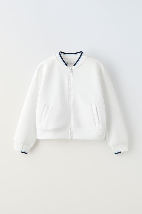 Bomber com gola alta e manga comprida. Fecho de correr à frente. Bolsos à frente.