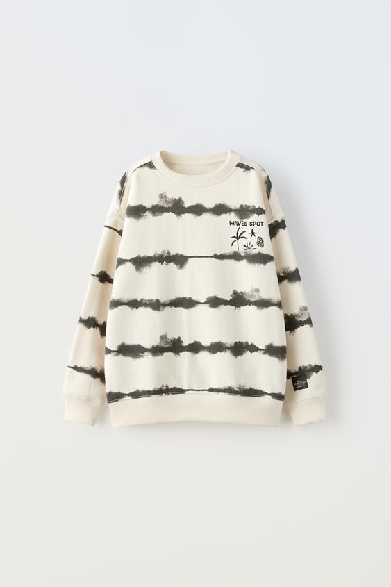 Sweatshirt com decote redondo e manga curta. Estampado no peitilho e às riscas tie-dye. Acabamentos em nervuras.
